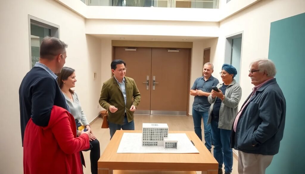 • Reunión de propietarios para discutir la necesidad de un ascensor.